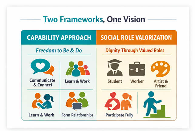 Social Role Valorization (SRV), developed by Dr. Wolf Wolfensberger, complements the Capability Approach by explaining how social perception determines access to those freedoms (Wolfensberger, 2013).
