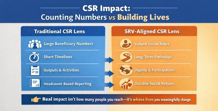 Social Role Valorization (SRV) offers CSR leaders a powerful framework to move beyond counting activities and beneficiaries toward enabling dignity, contribution, and long-term social integration. In India’s evolving CSR ecosystem — marked by heightened compliance, transparency, and accountability — this shift is not only ethical, but strategically sound.